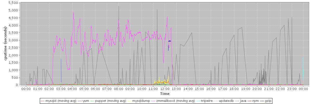 avg(mysqld) = 22.95 avg(yum) = 965.50 avg(puppet) = 13.64 avg(mysqldump) = 181.27 avg(zmmailboxd) = 1318.65 avg(tripwire) = 986.86 avg(updatedb) = 27.57 avg(java) = 457.56 avg(rpm) = 14.86 avg(gzip) = 2913.69