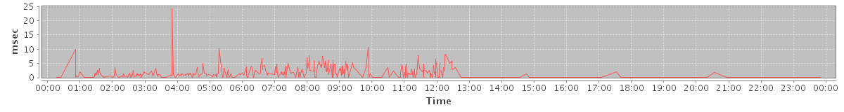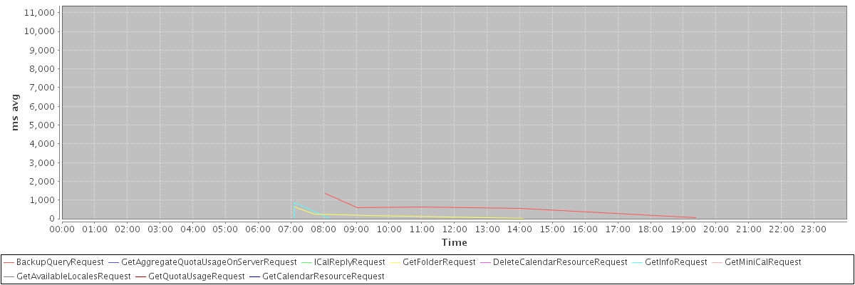 avg(BackupQueryRequest) = 640.80 avg(GetAggregateQuotaUsageOnServerRequest) = 913.00 avg(ICalReplyRequest) = 1184.00 avg(GetFolderRequest) = 256.50 avg(DeleteCalendarResourceRequest) = 10830.00 avg(GetInfoRequest) = 310.00 avg(GetMiniCalRequest) = 540.00 avg(GetAvailableLocalesRequest) = 89.00 avg(GetQuotaUsageRequest) = 1032.00 avg(GetCalendarResourceRequest) = 53.00