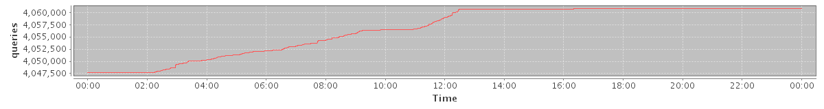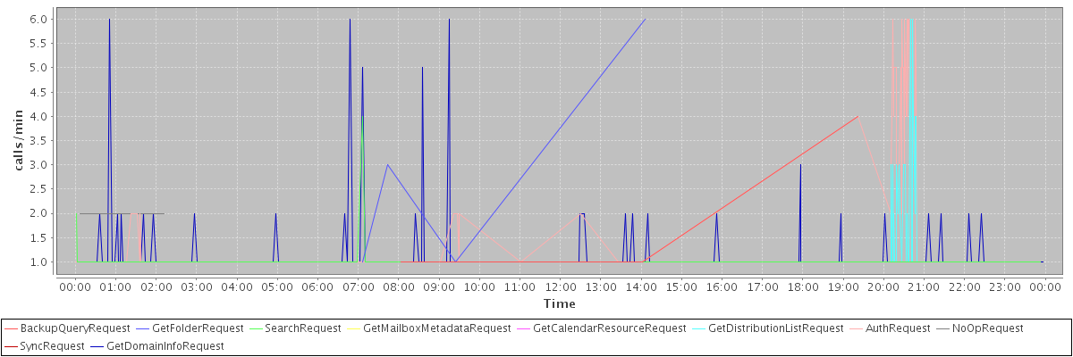 max(BackupQueryRequest) = 4.00 max(GetFolderRequest) = 6.00 max(SearchRequest) = 4.00 max(GetMailboxMetadataRequest) = 1.00 max(GetCalendarResourceRequest) = 1.00 max(GetDistributionListRequest) = 6.00 max(AuthRequest) = 6.00 max(NoOpRequest) = 2.00 max(SyncRequest) = 1.00 max(GetDomainInfoRequest) = 6.00