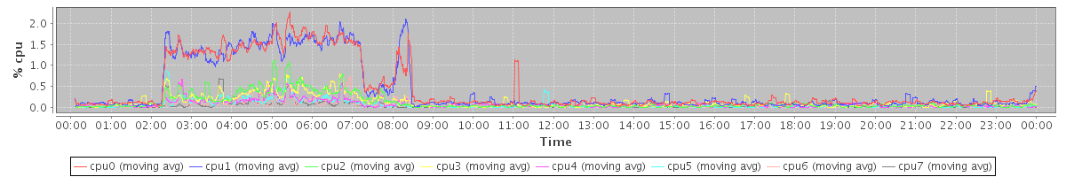 avg(cpu0) = 0.06 avg(cpu1) = 0.05 avg(cpu2) = 0.00 avg(cpu3) = 0.00 avg(cpu4) = 0.00 avg(cpu5) = 0.00 avg(cpu6) = 0.00 avg(cpu7) = 0.00