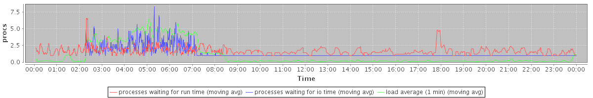 avg(processes waiting for run time) = 0.68 avg(processes waiting for io time) = 0.55 avg(load average (1 min)) = 1.06