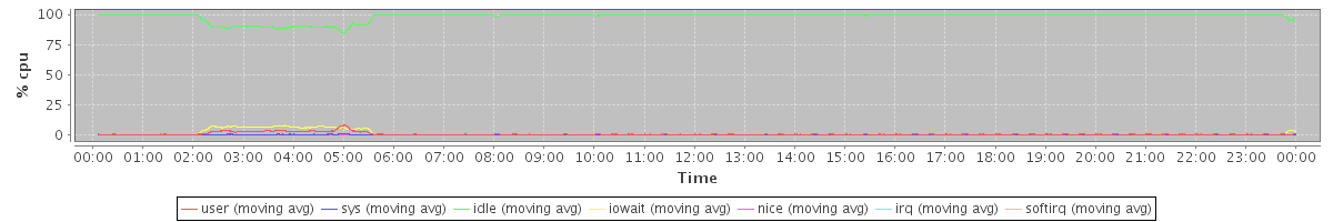 avg(user) = 0.84 avg(sys) = 0.12 avg(idle) = 98.07 avg(iowait) = 0.95 avg(nice) = 0.00 avg(irq) = 0.00 avg(softirq) = 0.00