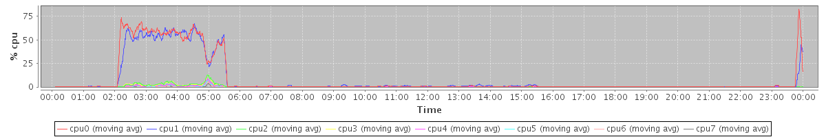 avg(cpu0) = 4.24 avg(cpu1) = 4.11 avg(cpu2) = 0.49 avg(cpu3) = 0.48 avg(cpu4) = 0.30 avg(cpu5) = 0.26 avg(cpu6) = 0.13 avg(cpu7) = 0.22