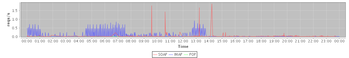 max(BackupQueryRequest) = 4.00 max(GetFolderRequest) = 15.00 max(SearchRequest) = 56.00 max(GetEffectiveFolderPermsRequest) = 42.00 max(GetAccountRequest) = 2.00 max(GetMiniCalRequest) = 8.00 max(GetDistributionListRequest) = 2.00 max(AuthRequest) = 4.00 max(ModifyAccountRequest) = 2.00 max(GetDomainInfoRequest) = 57.00
