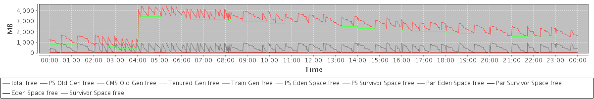 avg(total free) = 2623.53 avg(PS Old Gen free) = 0.00 avg(CMS Old Gen free) = 2108.38 avg(Tenured Gen free) = 0.00 avg(Train Gen free) = 0.00 avg(PS Eden Space free) = 0.00 avg(PS Survivor Space free) = 0.00 avg(Par Eden Space free) = 486.09 avg(Par Survivor Space free) = 29.06 avg(Eden Space free) = 0.00 avg(Survivor Space free) = 0.00