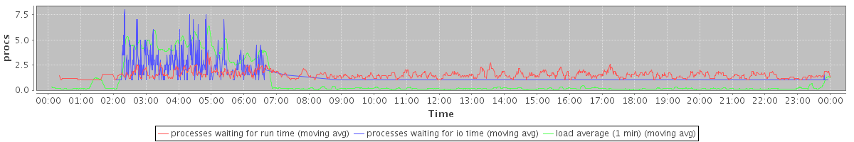 avg(processes waiting for run time) = 0.78 avg(processes waiting for io time) = 0.46 avg(load average (1 min)) = 0.94