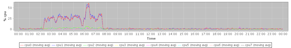 avg(cpu0) = 11.39 avg(cpu1) = 11.94 avg(cpu2) = 0.61 avg(cpu3) = 0.63 avg(cpu4) = 0.23 avg(cpu5) = 0.25 avg(cpu6) = 0.07 avg(cpu7) = 0.11