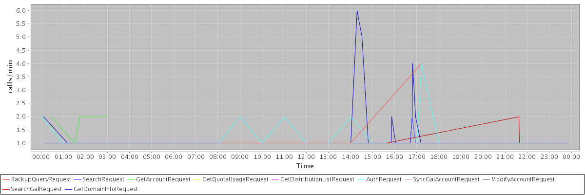 max(BackupQueryRequest) = 4.00 max(SearchRequest) = 2.00 max(GetAccountRequest) = 2.00 max(GetQuotaUsageRequest) = 1.00 max(GetDistributionListRequest) = 1.00 max(AuthRequest) = 4.00 max(SyncGalAccountRequest) = 1.00 max(ModifyAccountRequest) = 2.00 max(SearchGalRequest) = 2.00 max(GetDomainInfoRequest) = 6.00