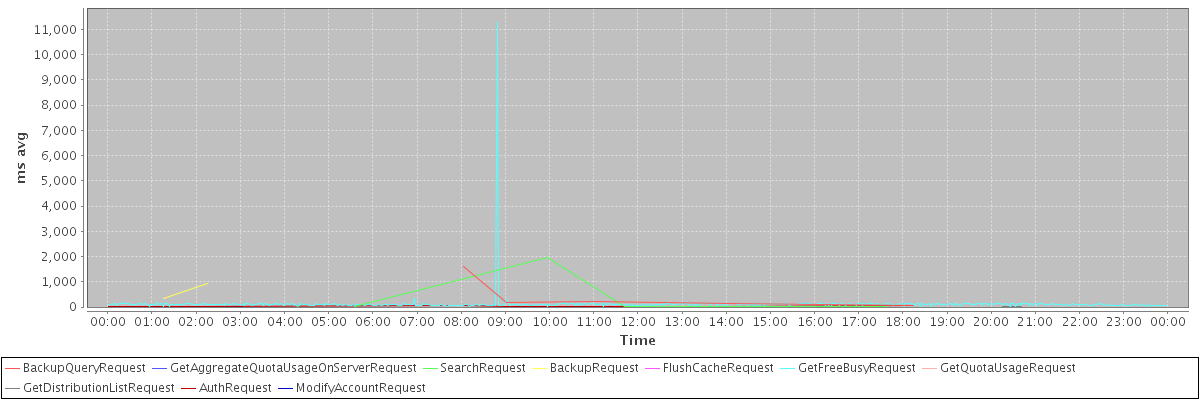 avg(BackupQueryRequest) = 447.60 avg(GetAggregateQuotaUsageOnServerRequest) = 1155.00 avg(SearchRequest) = 285.43 avg(BackupRequest) = 632.50 avg(FlushCacheRequest) = 5.00 avg(GetFreeBusyRequest) = 118.84 avg(GetQuotaUsageRequest) = 1960.00 avg(GetDistributionListRequest) = 1.83 avg(AuthRequest) = 28.62 avg(ModifyAccountRequest) = 7.62