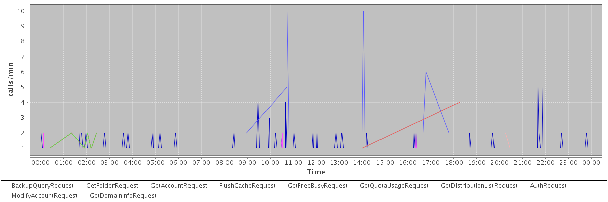 max(BackupQueryRequest) = 4.00 max(GetFolderRequest) = 10.00 max(GetAccountRequest) = 2.00 max(FlushCacheRequest) = 1.00 max(GetFreeBusyRequest) = 2.00 max(GetQuotaUsageRequest) = 1.00 max(GetDistributionListRequest) = 2.00 max(AuthRequest) = 4.00 max(ModifyAccountRequest) = 2.00 max(GetDomainInfoRequest) = 5.00