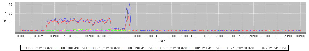 avg(cpu0) = 7.83 avg(cpu1) = 9.05 avg(cpu2) = 1.21 avg(cpu3) = 1.28 avg(cpu4) = 0.61 avg(cpu5) = 0.63 avg(cpu6) = 0.46 avg(cpu7) = 0.36