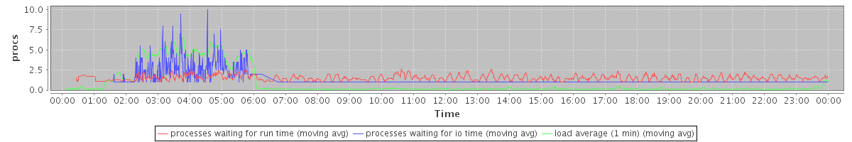 avg(processes waiting for run time) = 0.76 avg(processes waiting for io time) = 0.44 avg(load average (1 min)) = 0.90