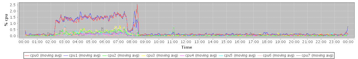 avg(cpu0) = 0.43 avg(cpu1) = 0.44 avg(cpu2) = 0.10 avg(cpu3) = 0.11 avg(cpu4) = 0.07 avg(cpu5) = 0.08 avg(cpu6) = 0.05 avg(cpu7) = 0.07