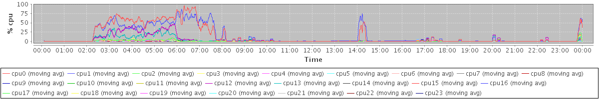 avg(cpu0) = 0.40 avg(cpu1) = 0.42 avg(cpu2) = 0.16 avg(cpu3) = 0.14 avg(cpu4) = 0.09 avg(cpu5) = 0.09 avg(cpu6) = 0.11 avg(cpu7) = 0.08 avg(cpu8) = 0.07 avg(cpu9) = 0.05 avg(cpu10) = 0.06 avg(cpu11) = 0.04 avg(cpu12) = 0.19 avg(cpu13) = 0.19 avg(cpu14) = 0.48 avg(cpu15) = 0.41 avg(cpu16) = 0.15 avg(cpu17) = 0.15 avg(cpu18) = 0.07 avg(cpu19) = 0.06 avg(cpu20) = 0.05 avg(cpu21) = 0.06 avg(cpu22) = 0.05 avg(cpu23) = 0.06