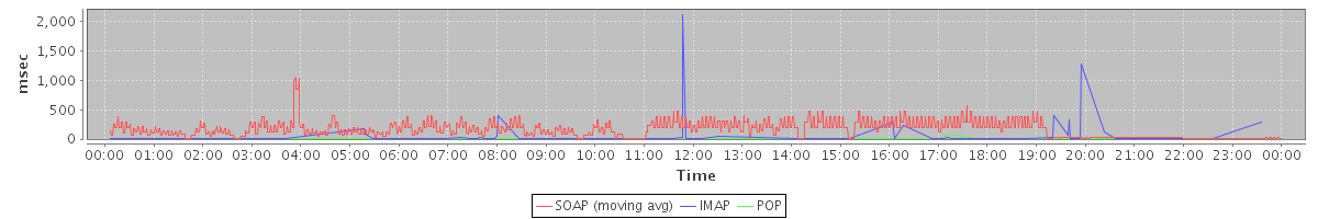 max(BackupQueryRequest) = 4.00 max(GetMsgRequest) = 64.00 max(SearchRequest) = 30.00 max(GetAccountRequest) = 2.00 max(GetFreeBusyRequest) = 61.00 max(GetDistributionListRequest) = 1.00 max(AuthRequest) = 4.00 max(ModifyAccountRequest) = 2.00 max(GetDomainInfoRequest) = 133.00 max(SyncRequest) = 3.00