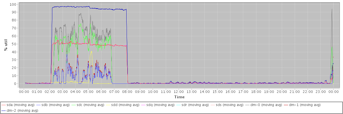 avg(sda) = 12.58 avg(sdb) = 2.26 avg(sdc) = 10.24 avg(sdd) = 0.64 avg(sdq) = 12.60 avg(sdr) = 2.26 avg(sds) = 10.24 avg(dm-0) = 12.40 avg(dm-1) = 2.59 avg(dm-2) = 24.06