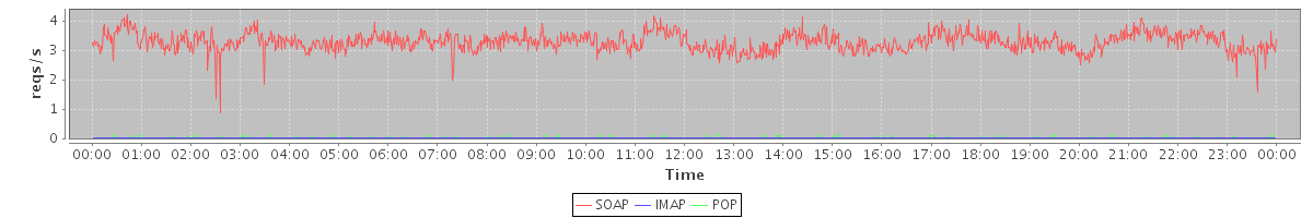 max(BackupQueryRequest) = 4.00 max(GetMsgRequest) = 118.00 max(GetFolderRequest) = 4.00 max(SearchRequest) = 36.00 max(FlushCacheRequest) = 1.00 max(GetDistributionListRequest) = 1.00 max(AuthRequest) = 4.00 max(ModifyAccountRequest) = 1.00 max(SyncRequest) = 1.00 max(GetDomainInfoRequest) = 127.00