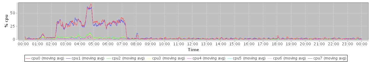avg(cpu0) = 11.39 avg(cpu1) = 11.48 avg(cpu2) = 0.82 avg(cpu3) = 0.80 avg(cpu4) = 0.42 avg(cpu5) = 0.40 avg(cpu6) = 0.24 avg(cpu7) = 0.17