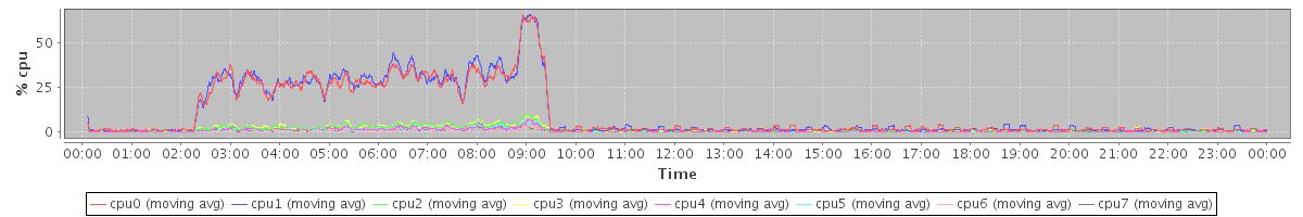 avg(cpu0) = 10.08 avg(cpu1) = 10.42 avg(cpu2) = 1.52 avg(cpu3) = 1.58 avg(cpu4) = 0.80 avg(cpu5) = 0.82 avg(cpu6) = 0.72 avg(cpu7) = 0.46