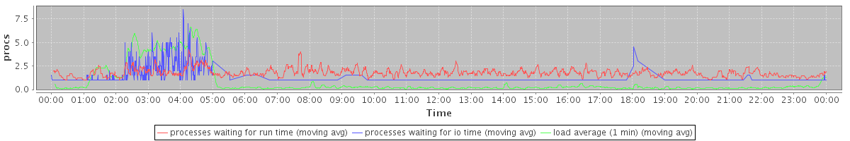 avg(processes waiting for run time) = 1.23 avg(processes waiting for io time) = 0.36 avg(load average (1 min)) = 0.79