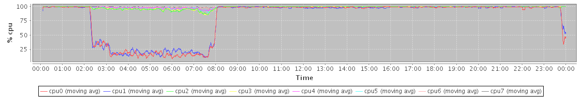 avg(cpu0) = 7.29 avg(cpu1) = 7.06 avg(cpu2) = 0.73 avg(cpu3) = 0.66 avg(cpu4) = 0.38 avg(cpu5) = 0.37 avg(cpu6) = 0.26 avg(cpu7) = 0.19