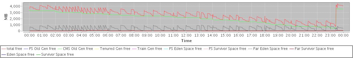 avg(total free) = 2578.72 avg(PS Old Gen free) = 0.00 avg(CMS Old Gen free) = 2080.61 avg(Tenured Gen free) = 0.00 avg(Train Gen free) = 0.00 avg(PS Eden Space free) = 0.00 avg(PS Survivor Space free) = 0.00 avg(Par Eden Space free) = 471.14 avg(Par Survivor Space free) = 26.97 avg(Eden Space free) = 0.00 avg(Survivor Space free) = 0.00