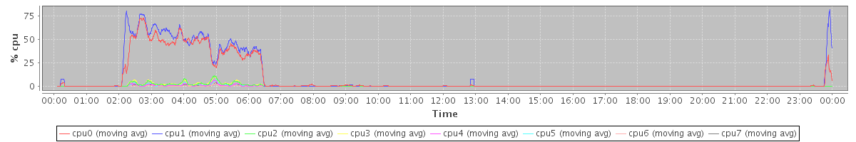 avg(cpu0) = 0.38 avg(cpu1) = 0.36 avg(cpu2) = 0.12 avg(cpu3) = 0.11 avg(cpu4) = 0.08 avg(cpu5) = 0.08 avg(cpu6) = 0.05 avg(cpu7) = 0.07