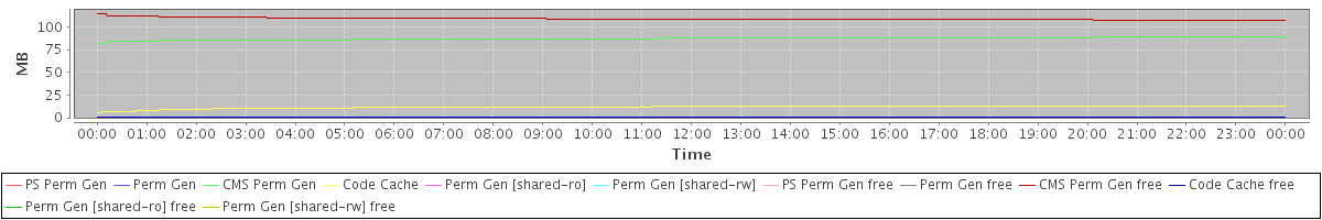 avg(PS Perm Gen) = 0.00 avg(Perm Gen) = 0.00 avg(CMS Perm Gen) = 86.92 avg(Code Cache) = 11.69 avg(Perm Gen [shared-ro]) = 0.00 avg(Perm Gen [shared-rw]) = 0.00 avg(PS Perm Gen free) = 0.00 avg(Perm Gen free) = 0.00 avg(CMS Perm Gen free) = 109.08 avg(Code Cache free) = 0.26 avg(Perm Gen [shared-ro] free) = 0.00 avg(Perm Gen [shared-rw] free) = 0.00