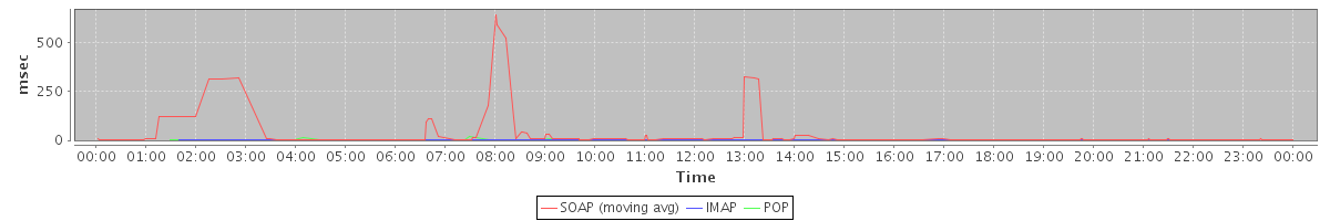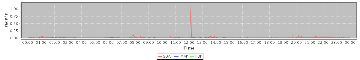 max(BackupQueryRequest) = 4.00 max(GetMsgRequest) = 2.00 max(GetFolderRequest) = 6.00 max(SearchRequest) = 34.00 max(BackupRequest) = 1.00 max(FlushCacheRequest) = 1.00 max(GetDistributionListRequest) = 2.00 max(GetMiniCalRequest) = 1.00 max(AuthRequest) = 4.00 max(GetDomainInfoRequest) = 36.00