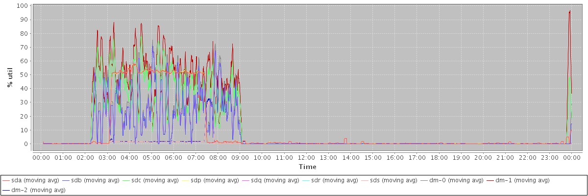 avg(sda) = 9.79 avg(sdb) = 7.72 avg(sdc) = 11.90 avg(sdp) = 9.79 avg(sdq) = 7.73 avg(sdr) = 11.90 avg(sds) = 0.68 avg(dm-0) = 8.50 avg(dm-1) = 14.48 avg(dm-2) = 0.76