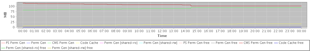 avg(PS Perm Gen) = 0.00 avg(Perm Gen) = 0.00 avg(CMS Perm Gen) = 89.55 avg(Code Cache) = 12.55 avg(Perm Gen [shared-ro]) = 0.00 avg(Perm Gen [shared-rw]) = 0.00 avg(PS Perm Gen free) = 0.00 avg(Perm Gen free) = 0.00 avg(CMS Perm Gen free) = 106.45 avg(Code Cache free) = 0.20 avg(Perm Gen [shared-ro] free) = 0.00 avg(Perm Gen [shared-rw] free) = 0.00