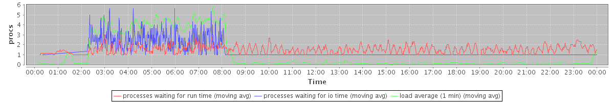 avg(processes waiting for run time) = 0.72 avg(processes waiting for io time) = 0.60 avg(load average (1 min)) = 1.13