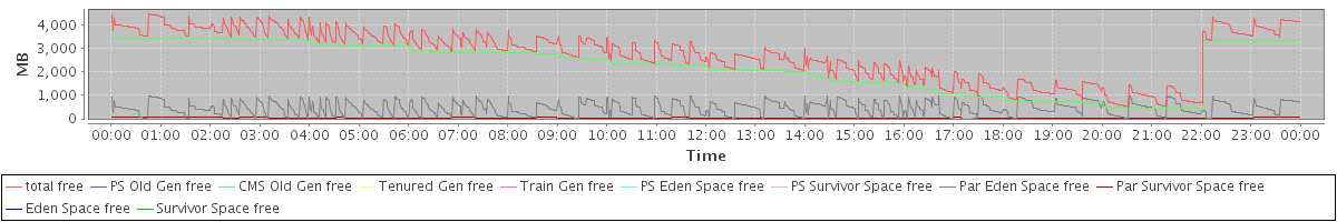 avg(total free) = 2746.14 avg(PS Old Gen free) = 0.00 avg(CMS Old Gen free) = 2261.51 avg(Tenured Gen free) = 0.00 avg(Train Gen free) = 0.00 avg(PS Eden Space free) = 0.00 avg(PS Survivor Space free) = 0.00 avg(Par Eden Space free) = 452.92 avg(Par Survivor Space free) = 31.71 avg(Eden Space free) = 0.00 avg(Survivor Space free) = 0.00