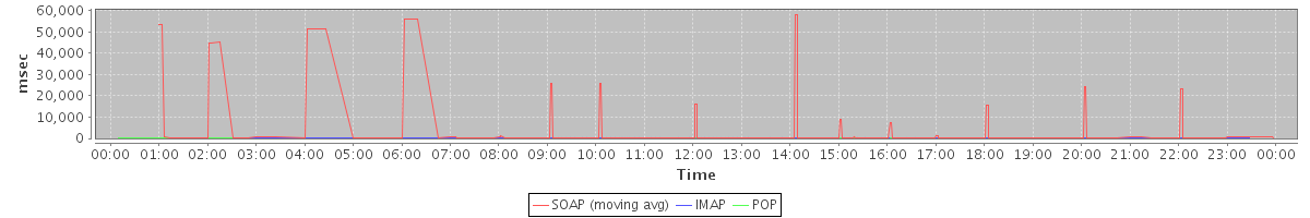 max(BackupQueryRequest) = 4.00 max(GetEffectiveFolderPermsRequest) = 137.00 max(GetInfoRequest) = 4.00 max(GetMiniCalRequest) = 69.00 max(AuthRequest) = 4.00 max(GetFolderRequest) = 4.00 max(SearchRequest) = 68.00 max(NoOpRequest) = 10.00 max(GetDomainInfoRequest) = 6.00 max(SearchGalRequest) = 21.00