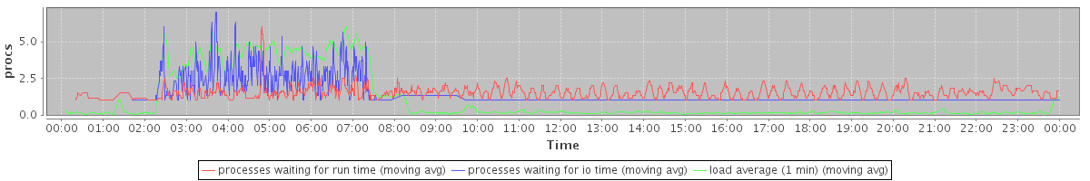avg(processes waiting for run time) = 0.73 avg(processes waiting for io time) = 0.58 avg(load average (1 min)) = 1.08