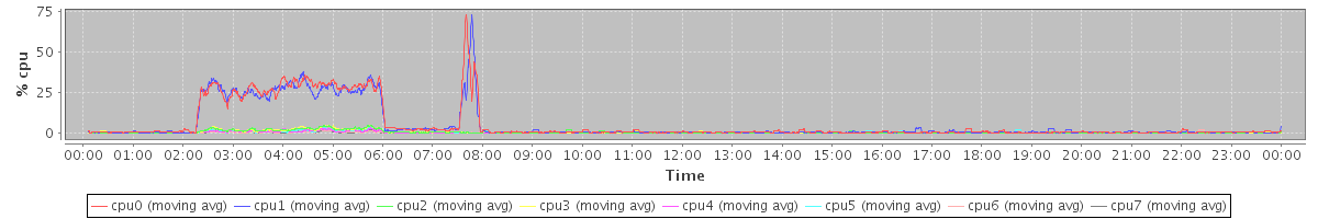 avg(cpu0) = 5.62 avg(cpu1) = 5.36 avg(cpu2) = 0.53 avg(cpu3) = 0.53 avg(cpu4) = 0.29 avg(cpu5) = 0.33 avg(cpu6) = 0.23 avg(cpu7) = 0.14