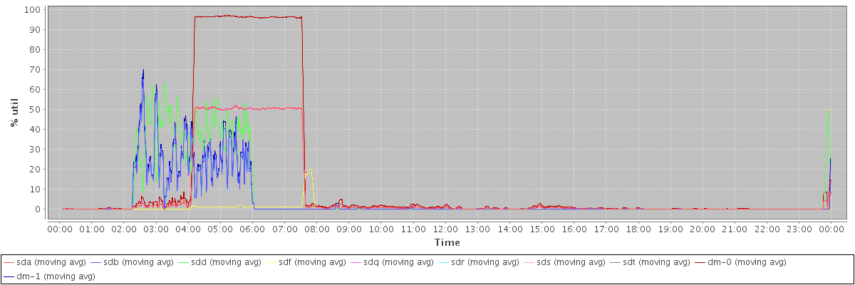 avg(sda) = 7.68 avg(sdb) = 3.98 avg(sdd) = 6.36 avg(sdf) = 0.43 avg(sdq) = 7.68 avg(sdr) = 3.99 avg(sds) = 6.36 avg(sdt) = 0.43 avg(dm-0) = 14.64 avg(dm-1) = 4.39
