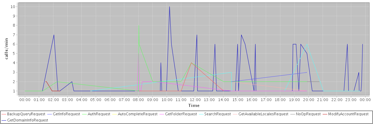 max(BackupQueryRequest) = 4.00 max(GetInfoRequest) = 3.00 max(AuthRequest) = 8.00 max(AutoCompleteRequest) = 6.00 max(GetFolderRequest) = 5.00 max(SearchRequest) = 6.00 max(GetAvailableLocalesRequest) = 2.00 max(NoOpRequest) = 2.00 max(ModifyAccountRequest) = 2.00 max(GetDomainInfoRequest) = 10.00