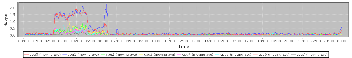 avg(cpu0) = 0.25 avg(cpu1) = 0.29 avg(cpu2) = 0.08 avg(cpu3) = 0.08 avg(cpu4) = 0.05 avg(cpu5) = 0.09 avg(cpu6) = 0.07 avg(cpu7) = 0.03