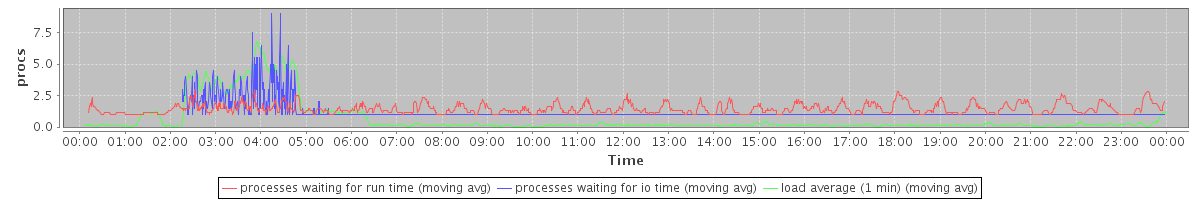 avg(processes waiting for run time) = 0.71 avg(processes waiting for io time) = 0.31 avg(load average (1 min)) = 0.67