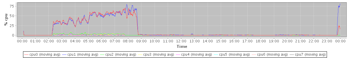 avg(cpu0) = 13.30 avg(cpu1) = 13.77 avg(cpu2) = 0.74 avg(cpu3) = 0.63 avg(cpu4) = 0.33 avg(cpu5) = 0.30 avg(cpu6) = 0.12 avg(cpu7) = 0.09
