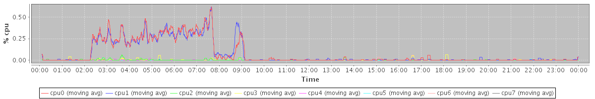 avg(cpu0) = 0.53 avg(cpu1) = 0.57 avg(cpu2) = 0.19 avg(cpu3) = 0.20 avg(cpu4) = 0.11 avg(cpu5) = 0.10 avg(cpu6) = 0.07 avg(cpu7) = 0.07