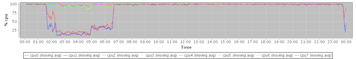 avg(cpu0) = 6.15 avg(cpu1) = 6.16 avg(cpu2) = 0.84 avg(cpu3) = 0.65 avg(cpu4) = 0.47 avg(cpu5) = 0.39 avg(cpu6) = 0.19 avg(cpu7) = 0.19