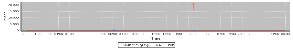 max(BackupQueryRequest) = 4.00 max(GetEffectiveFolderPermsRequest) = 3.00 max(GetFreeBusyRequest) = 24.00 max(AuthRequest) = 4.00 max(GetFolderRequest) = 8.00 max(SearchRequest) = 3.00 max(GetAvailableLocalesRequest) = 2.00 max(ModifyAccountRequest) = 2.00 max(NoOpRequest) = 2.00 max(GetDomainInfoRequest) = 24.00