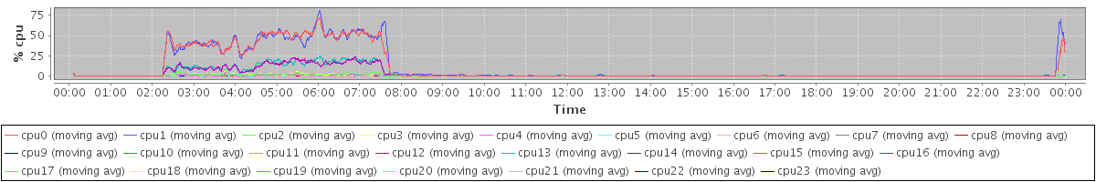 avg(cpu0) = 7.22 avg(cpu1) = 7.36 avg(cpu2) = 0.84 avg(cpu3) = 0.86 avg(cpu4) = 0.49 avg(cpu5) = 0.48 avg(cpu6) = 0.23 avg(cpu7) = 0.40 avg(cpu8) = 0.17 avg(cpu9) = 0.18 avg(cpu10) = 0.18 avg(cpu11) = 0.16 avg(cpu12) = 1.24 avg(cpu13) = 1.39 avg(cpu14) = 2.39 avg(cpu15) = 2.48 avg(cpu16) = 0.98 avg(cpu17) = 1.20 avg(cpu18) = 0.41 avg(cpu19) = 0.38 avg(cpu20) = 0.18 avg(cpu21) = 0.25 avg(cpu22) = 0.11 avg(cpu23) = 0.19