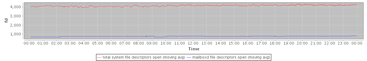 avg(total system file descriptors open) = 4139.65 avg(mailboxd file descriptors open) = 752.02