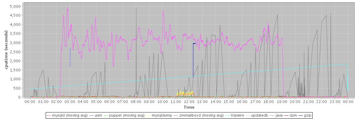 avg(mysqld) = 24.44 avg(yum) = 2206.00 avg(puppet) = 13.68 avg(mysqldump) = 179.32 avg(zmmailboxd) = 2175.95 avg(tripwire) = 801.50 avg(updatedb) = 32.21 avg(java) = 408.63 avg(rpm) = 11.36 avg(gzip) = 2890.22