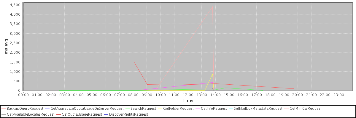 avg(BackupQueryRequest) = 514.00 avg(GetAggregateQuotaUsageOnServerRequest) = 862.00 avg(SearchRequest) = 45.83 avg(GetFolderRequest) = 151.00 avg(GetInfoRequest) = 152.00 avg(SetMailboxMetadataRequest) = 113.00 avg(GetMiniCalRequest) = 1525.67 avg(GetAvailableLocalesRequest) = 58.50 avg(GetQuotaUsageRequest) = 925.00 avg(DiscoverRightsRequest) = 29.50