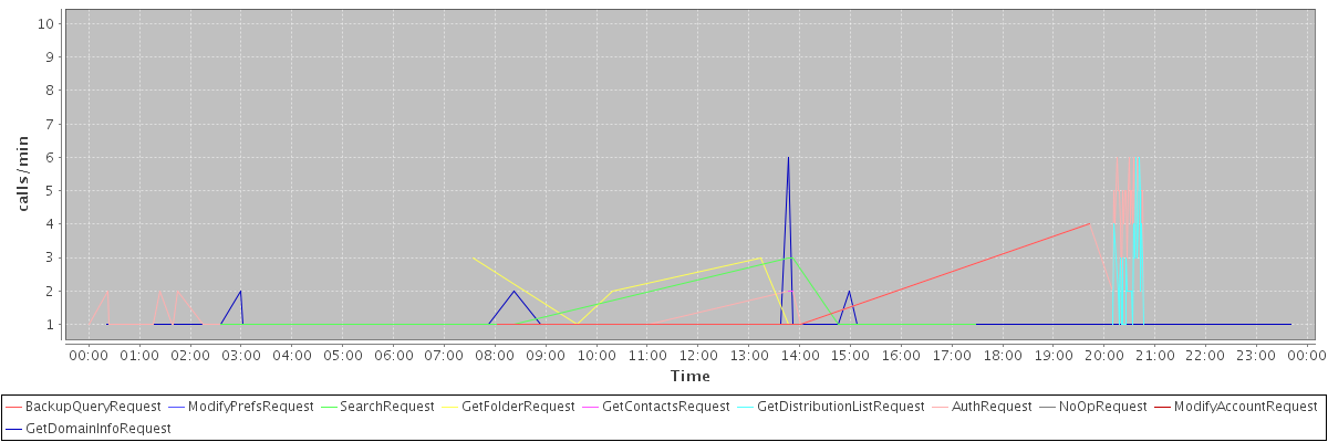 max(BackupQueryRequest) = 4.00 max(ModifyPrefsRequest) = 6.00 max(SearchRequest) = 3.00 max(GetFolderRequest) = 3.00 max(GetContactsRequest) = 2.00 max(GetDistributionListRequest) = 6.00 max(AuthRequest) = 6.00 max(NoOpRequest) = 10.00 max(ModifyAccountRequest) = 2.00 max(GetDomainInfoRequest) = 6.00