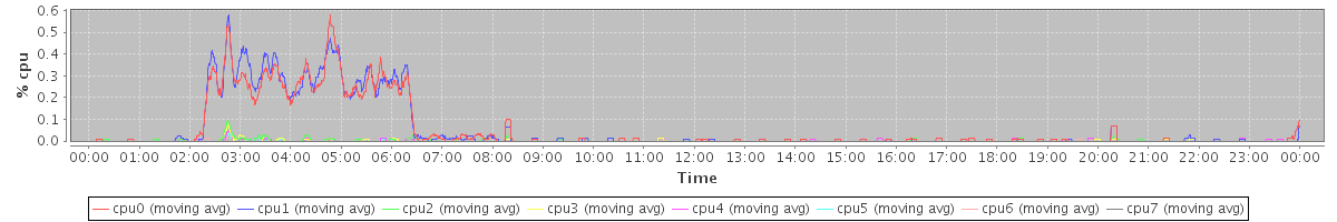 avg(cpu0) = 0.45 avg(cpu1) = 0.43 avg(cpu2) = 0.15 avg(cpu3) = 0.15 avg(cpu4) = 0.09 avg(cpu5) = 0.08 avg(cpu6) = 0.04 avg(cpu7) = 0.06